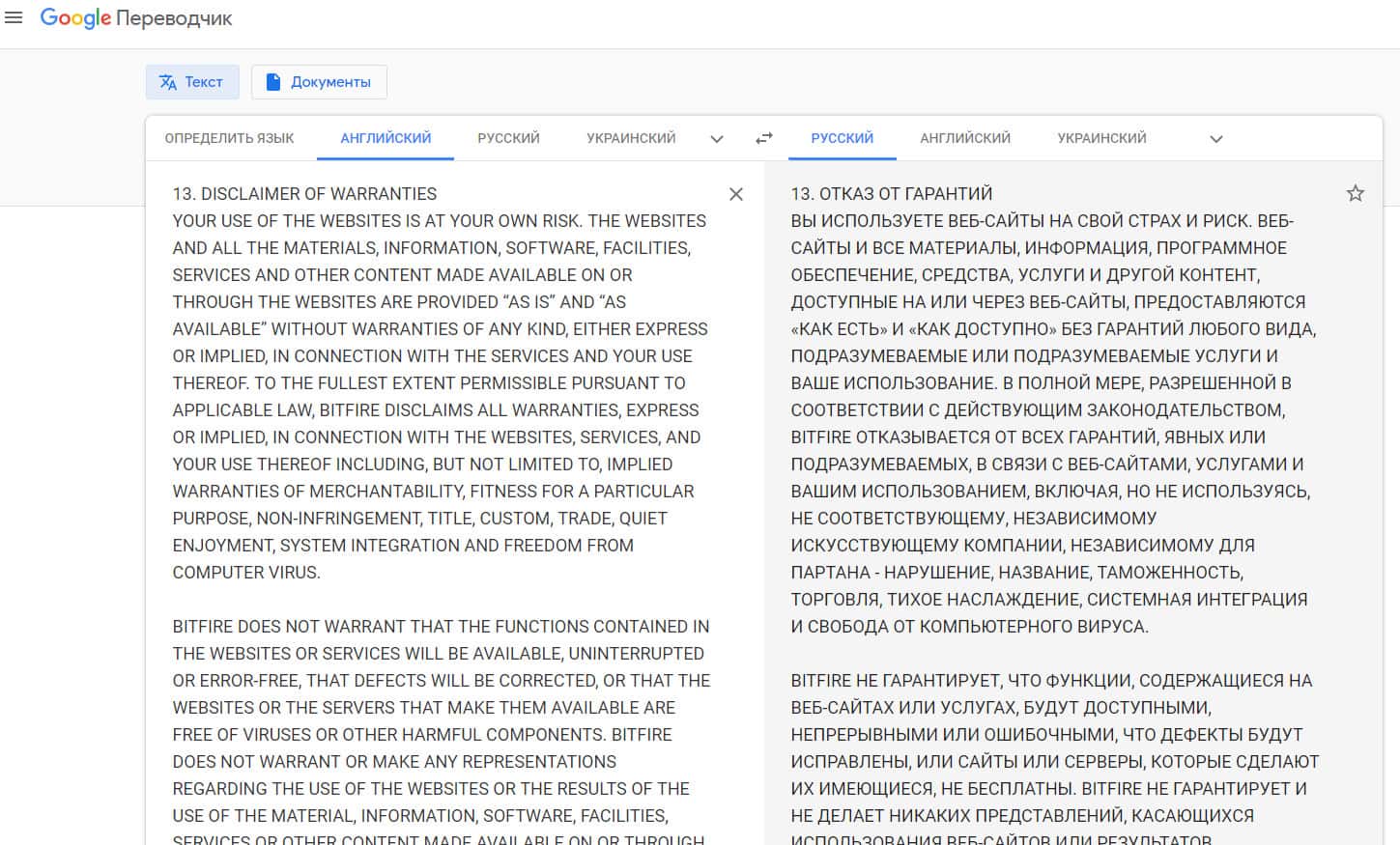 Имеется у проходимцев TigerWit и условие о том, что аферисты Битфаир Майнинг могут в любой момент по своему усмотрению без предварительного уведомления изменить свои условия сотрудничества, или же непосредственно условия торговли. При этом пользователь автоматически соглашается с данными изменениями условий сотрудничества от мошенников.