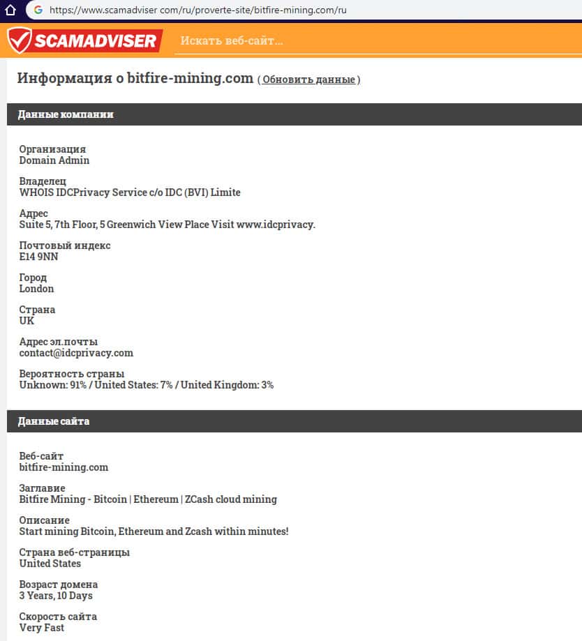 В связи с мошеннической и противозаконной деятельностью лохотрона Bitfire-Mining его реальные руководители предпочитают анонимность дабы избежать ответственности со стороны правоохранительных органов. Техническую же информацию о сайте жулья Битфаир Майнинг можно узнать с помощью портала scamadviser com, что вы можете наглядно увидеть ниже.