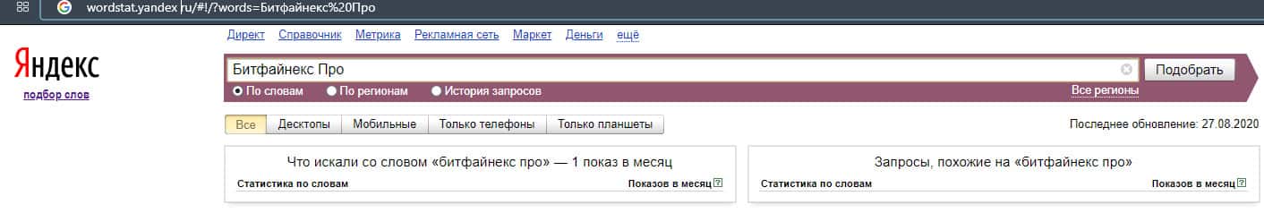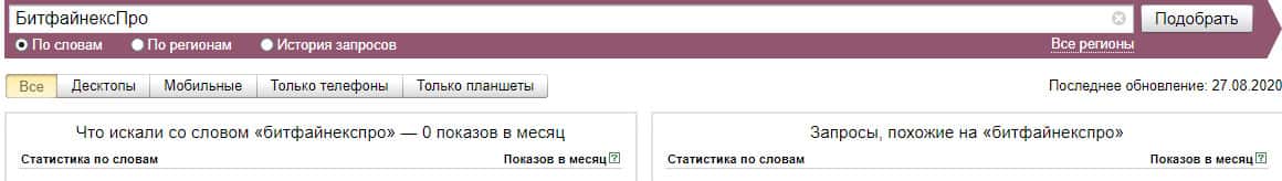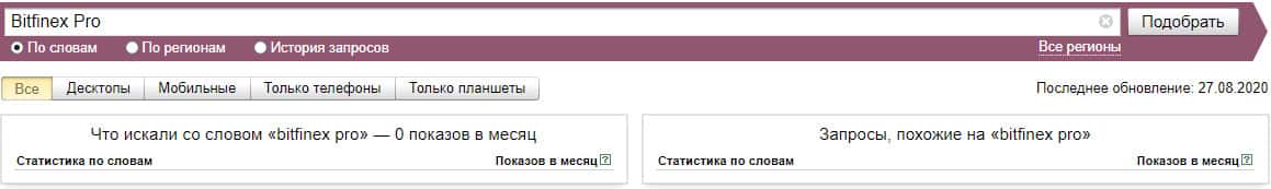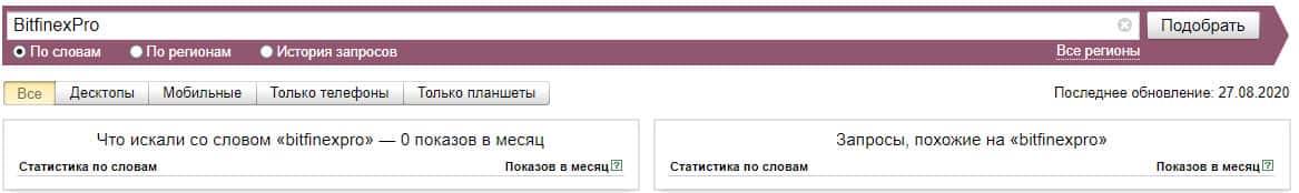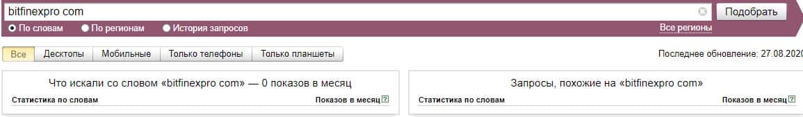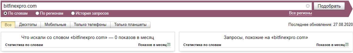 Если взять и пробить в Яндекс.Вордстат чисто домен сайта без точки "bitfinexpro com", то система выдает нам 0 показов в месяц.