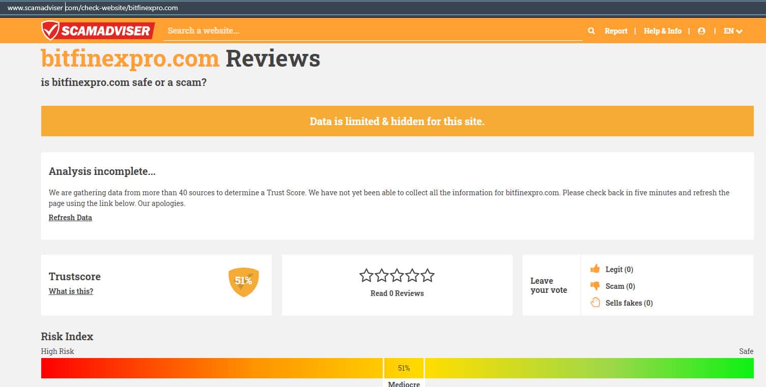 Судя по информации с сайта scamadviser com, контора BitfinexPro находится под сомнением, так как особо они не заморачивались в создании и поддержке своего ресурса.
