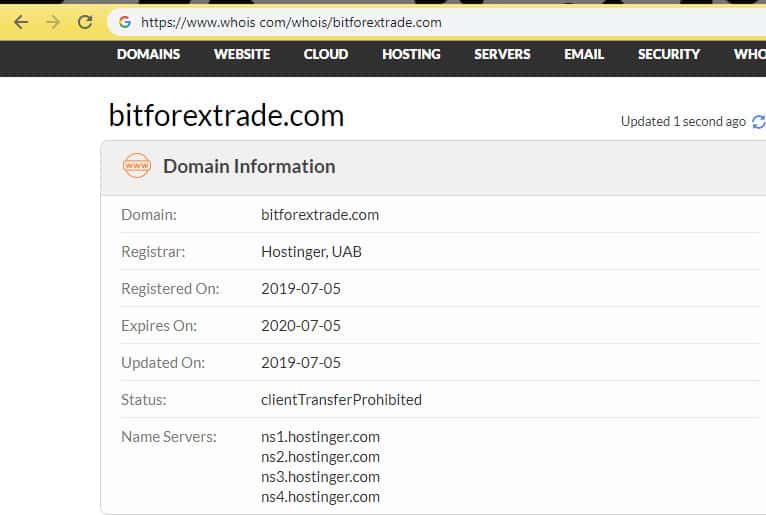 На сайте whois com удалось провести небольшой анализ и отыскать некоторую информацию, а точнее ее остатки от соскамленной шараги БитФорекс Трейд. На изображении ниже представлена информация о домене, который использовался во время работы лохотрона и для сливания счетов пользователей.