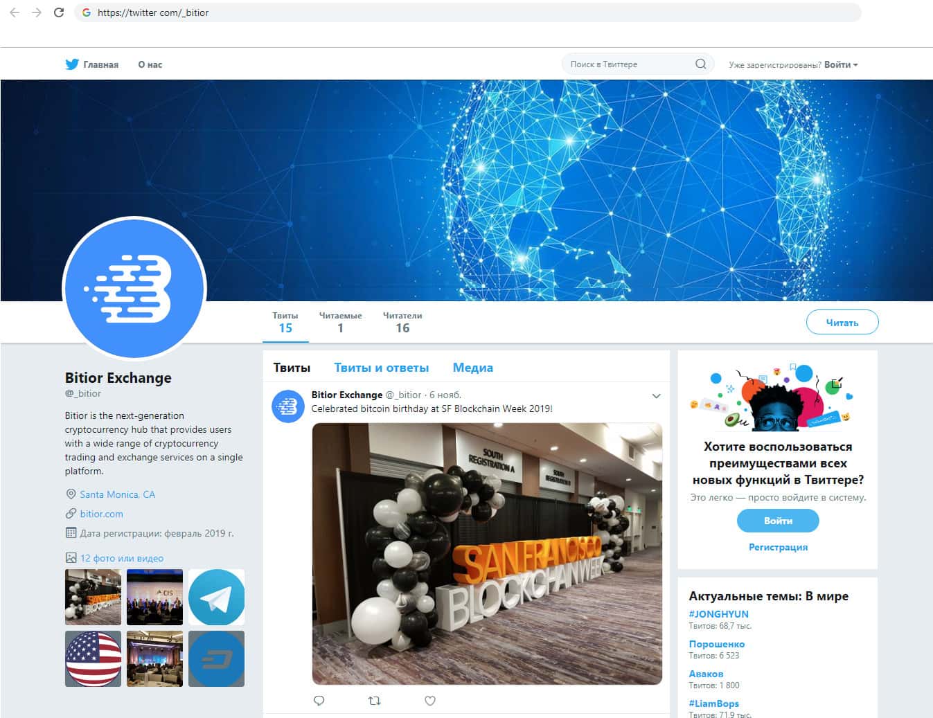 Что бы мошенники могли охарактеризовать свою компанию как "серьёзная криптовалютная биржа" они представили страницы в социальных сетях. В твитере они создали аккаунт, на который подписалось аж 16 человек. Это говорит о том, что их деятельность никого не интересует на просторах твитера.