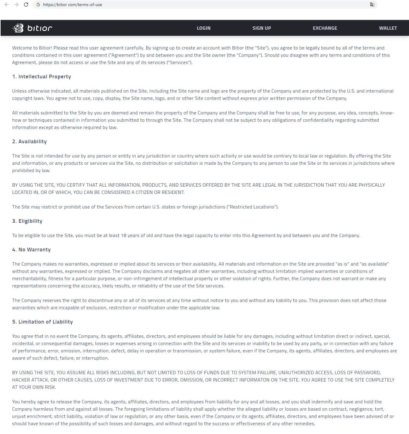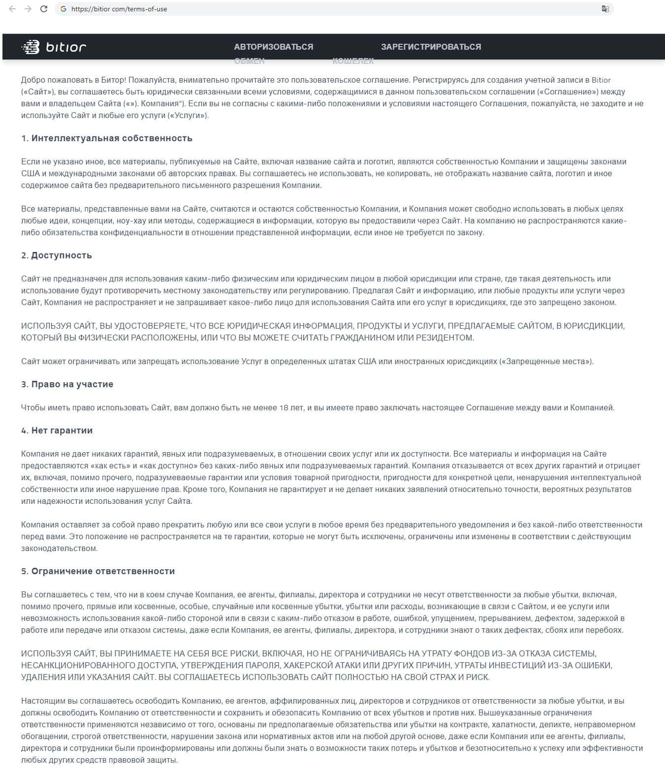 Компания Битиор предлагает своё пользовательское соглашение, в котором с начала предлагает свои услуги, красиво описывает деятельность компании, а потом снимает с себя всю ответственность, если хоть что то пойдёт не так. Мошенники сразу говорят, что они ни за что не отвечают и никакая ответственность им не нужна.