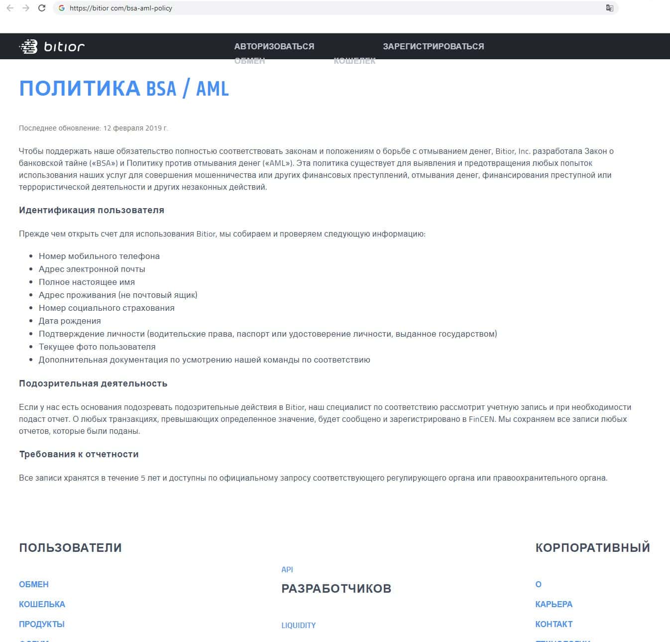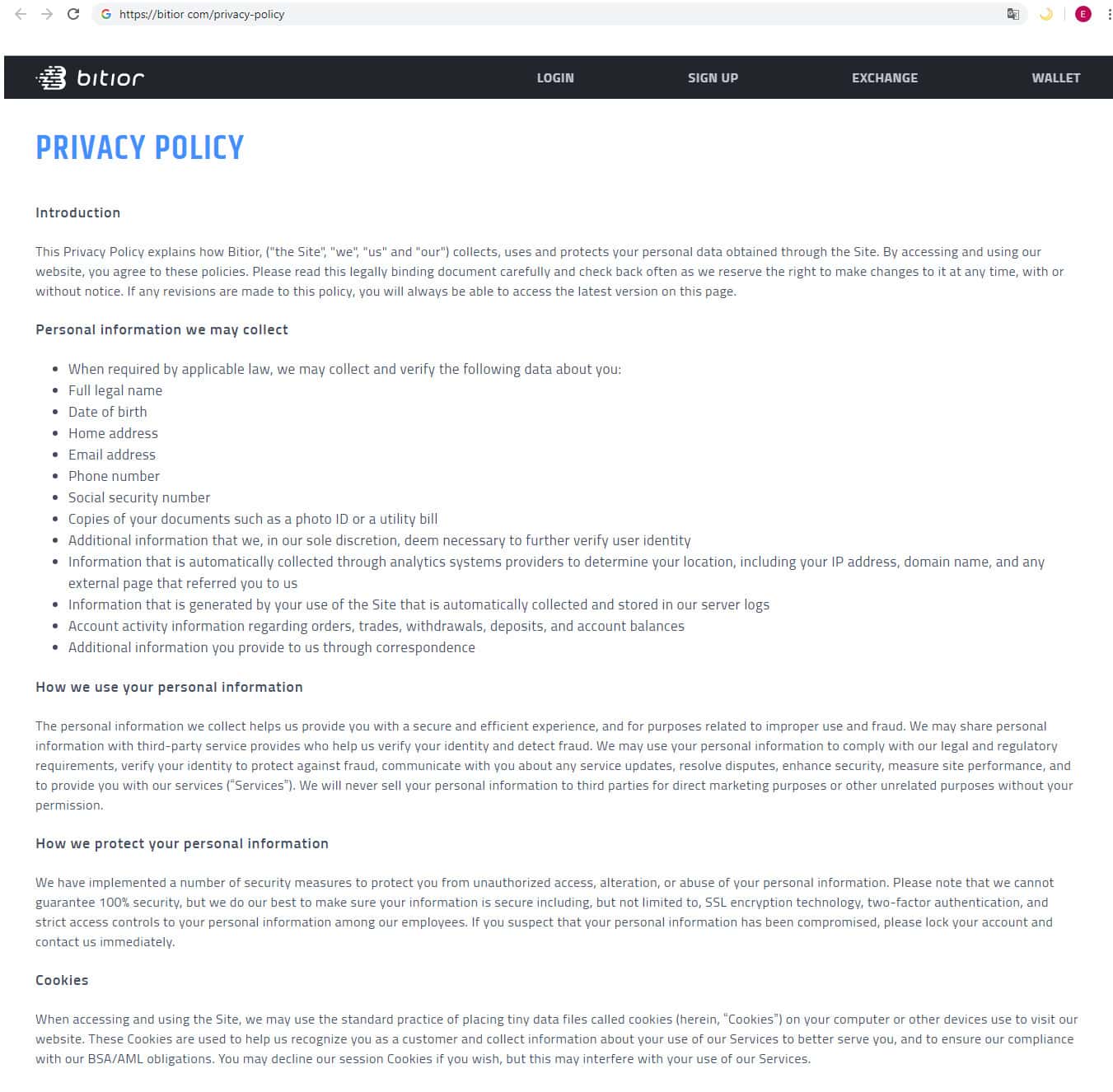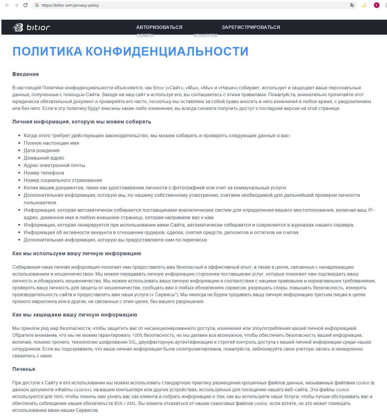 Нашему вниманию представлена политика конфиденциальности мошенников Битиор. Они хвастаются высоким уровнем защиты личных данных клиента, описывают как они защищают, и что клиенту не о чем беспокоится, но для проверки клиентов, они передают их информацию сторонним поставщикам услуг, а за их деятельность Битиор не отвечает.