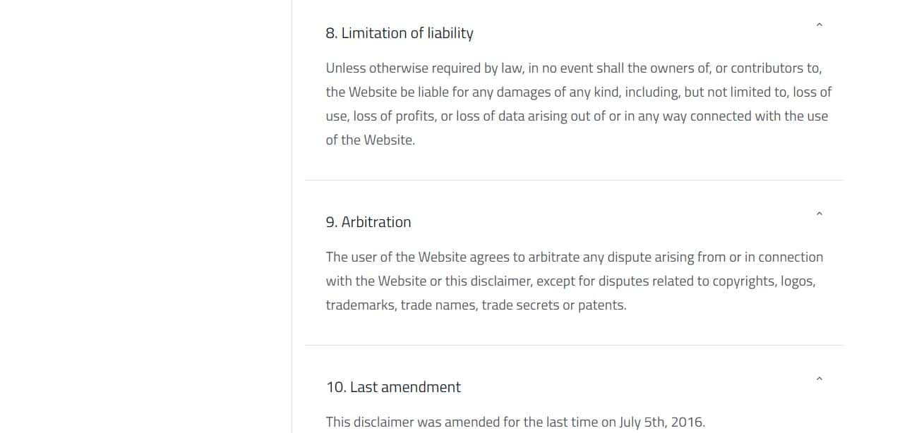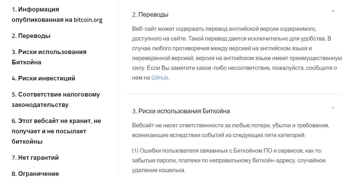 В данном разделе сайта аферисты Bitcoin Org разместили информацию о том, что они не несут ни какой ответственности за пользователей которые пользуются данным сайтом и хотят зарабатывать на биткоине.