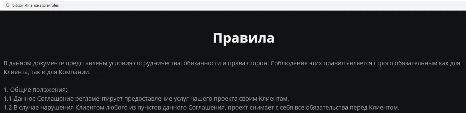 - Клиентское соглашение на интернет-сервисе скам-конторы Биткоин Финанс