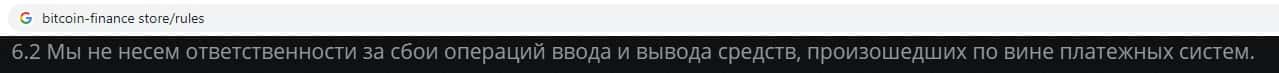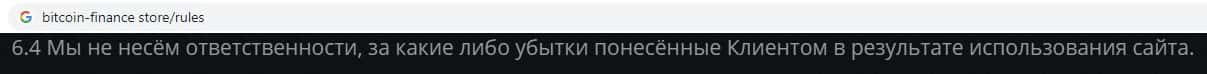 Согласно тому, что аферисты пишут в соглашении, скам-компания Bitcoin Finance не несет никакой ответственности за не полученную прибыль клиентом, а так же за возможные убытки.