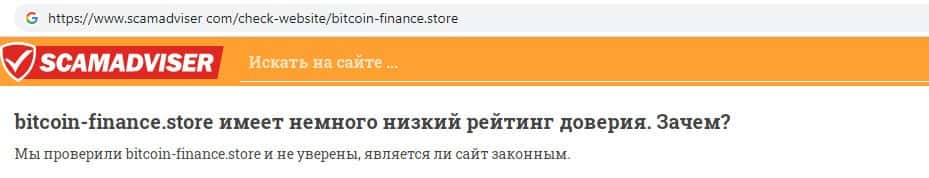 Проверка Биткоин Финанс на сайте scamadviser com показала, что у данного сайта низкий рейтинг доверия, а также выявлено множество отрицательных моментов в работе сервера.