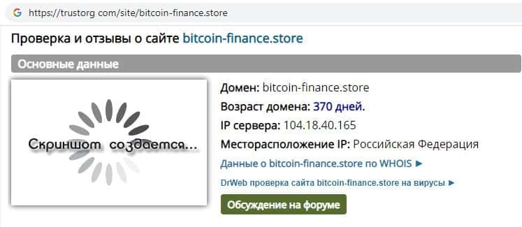 Проверка интернет-сервиса шулеров Bitcoin-Finance на trustorg com показала, что возраст домена к моменту написания статьи составляет 370 дней, скорее всего домен купленный.