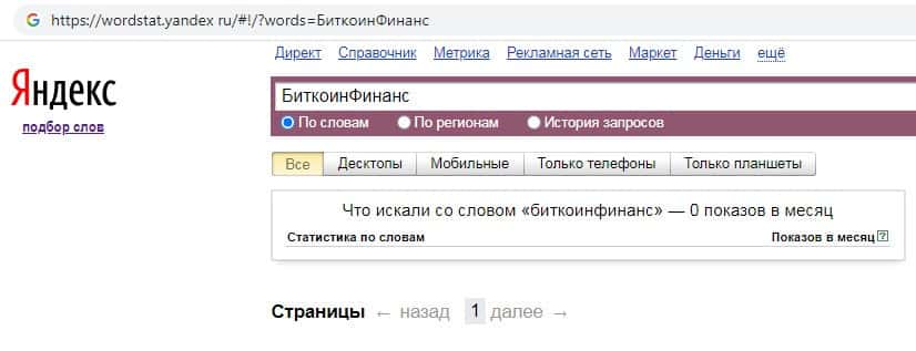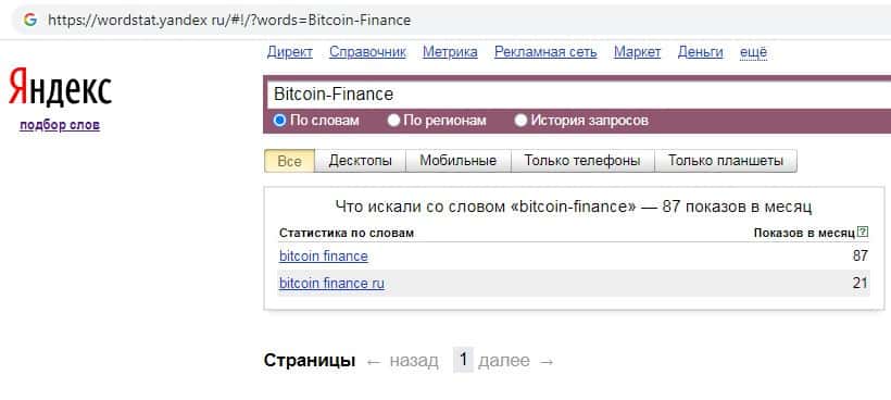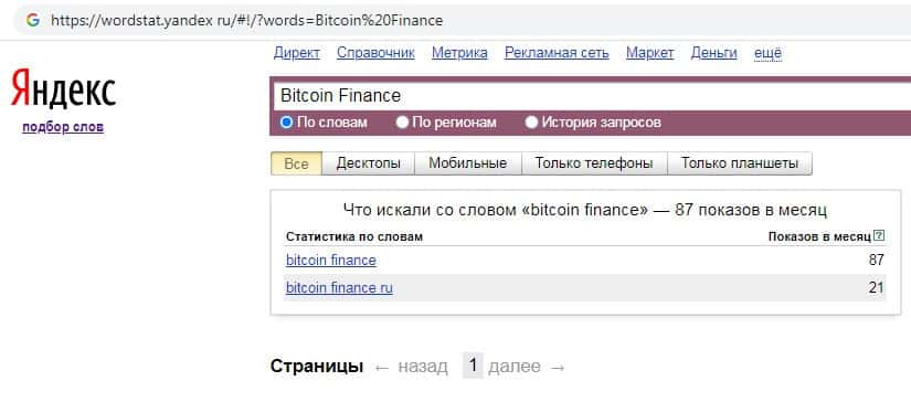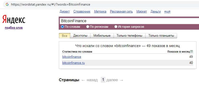 Количество брендовых запросов названия компании на русском языке с пробелом "Биткоин Финанс" на wordstat yandex ru составляет 32 запроса за месяц.