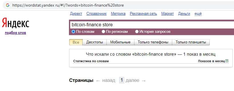 По количеству брендовых запросов названия домена компании без точки "bitcoin-finance store" на wordstat yandex ru показатель тот же, а именно 1 запрос за месяц.