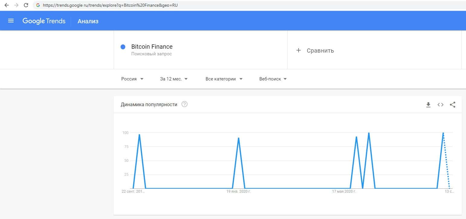 По брендовым запросам названия компании на английском языке с пробелом "Bitcoin Finance" на trends google ru отслеживается некая динамика популярности.