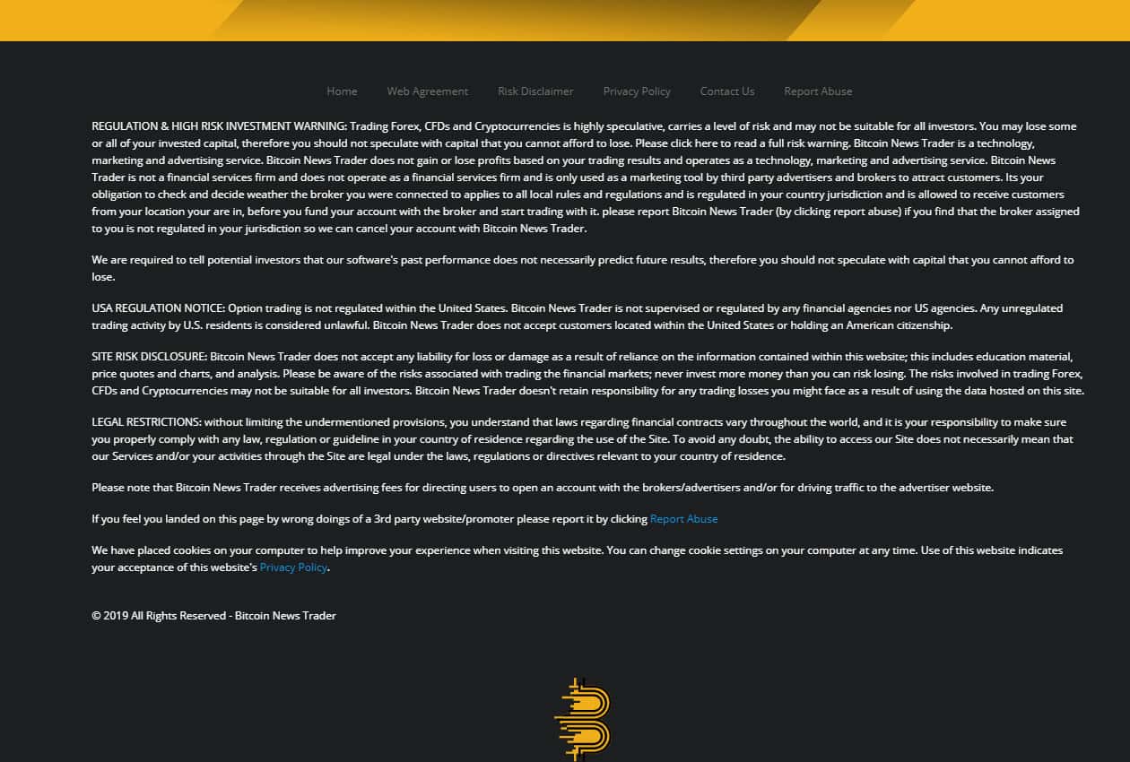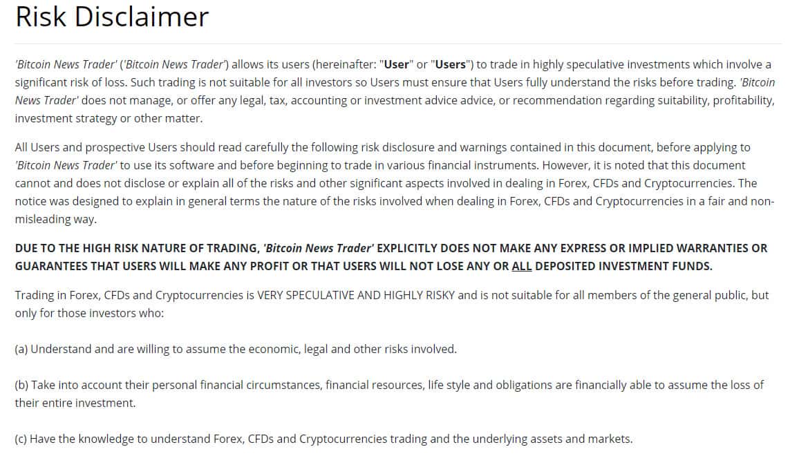 После в условиях сотрудничества мошенников БитКоин Ньюс Трейдер следует типичный отказ от ответственности за потери наивных пользователей сети интернет, связанные непосредственно с данным подвальным сайтом. На изображении, расположенном ниже, вы можете наглядно увидеть и прочесть отказ от ответственности жулья Bitcoin News Trader.