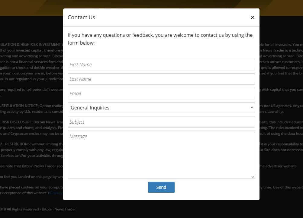 Под контакты мошенники Bitcoin News Trader не отводили отдельный раздел своего сайта, да и самых контактов для связи с ними никаких не указали. Вместо этого у проходимцев БитКоин Ньюс Трейдер имеется форма для обратной связи с наивной клиентурой сети интернет. На изображении, расположенном ниже, вы можете увидеть данный ход аферистов.