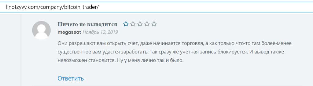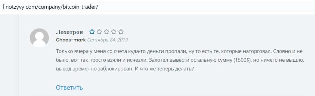 Сообщение на сайте finotzyvy com: куда-то пропали деньги со счета на платформе Биткоин Трейдер