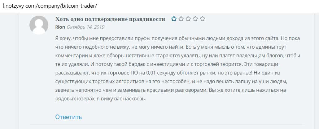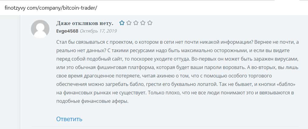 - Отзыв пользователя на сайте Финотзывы о Биткоин Трейдер: давно не встречал такого откровенно шулерского проекта!