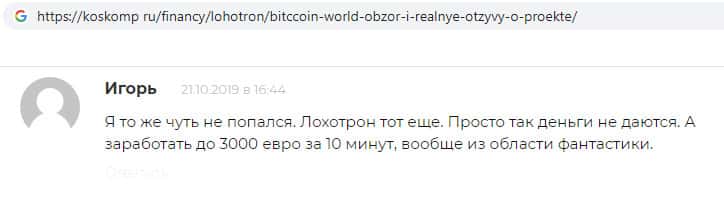 Пользователь рассказывает, как чуть ли не стал жертвой жуликов Bitcoin World, так как тоже почти поверил уговором, но вовремя остановился, так как заработал здравый смысл, что деньги просто так не достаются, а компания предлагает три тысячи евро за всего десять минут работы на сайте жуликов, что является из области фантастики.