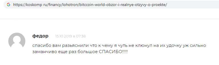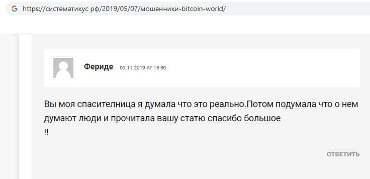 - Благоодарность пользователя за информацию о жуликах Биткоин Ворлд