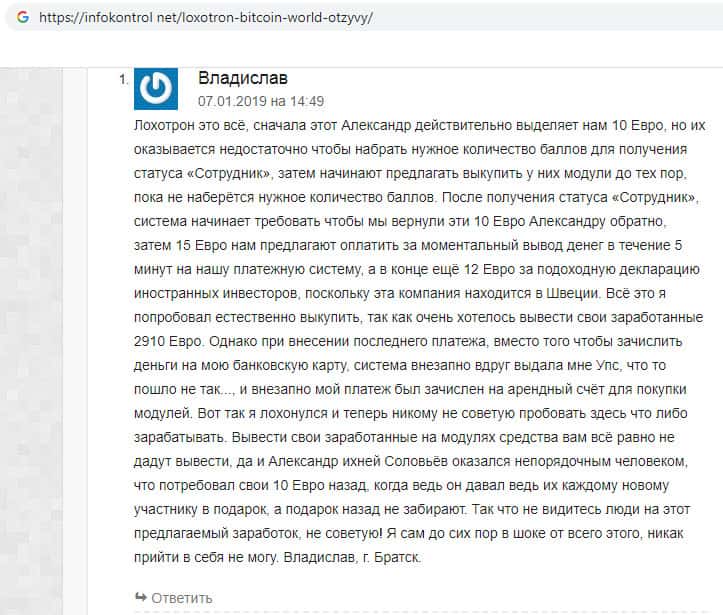Один из клиентов мошеннической организации Биткоин Ворлд выразился по поводу компании. В своём оставленном отзыве пользователь назвал контору "Лохотрон - абсолютный". Он выразился коротко, но очень точно охарактеризовал контору, так как всё, что делает фирма является мошенничеством и сделано для того, что бы вытянуть деньги из клиентов.