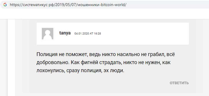 В данном отзыве пользователь рассказывает, что если обманутые клиенты кидал Bitcoin World обратятся в полицию, то там им ничем не помогут, так как жулики не требовали деньги, а выставляли всё так, что клиент добровольно переводил деньги на счёт компании, но то ведь тоже несправедливо, так как кидалы пользовались доверчивостью людей.