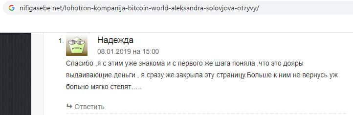 Некая "Надежда" сообщает нам о том, что раскусила эту фирму с первого раза, и сразу поняла, что Bitcoin World это самая настоящая мошенническая организация, которая выдаивает деньги со своих клиентов. С каждым днём жуликам становится всё сложнее и сложнее обманывать клиентов, и находить новых, так как информация о них быстро распространяется.