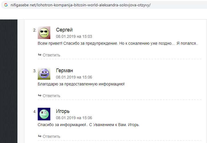 Вашему вниманию предоставлены несколько отзывов о разводилах Биткоин Ворлд. Содержание их почти одинаково, все люди благодарят других пользователей о предоставленной информации о мошенниках. К сожалению некоторые из них уже попались на уговоры жуликов, но всё равно соскочили, сохранив остатки денег.