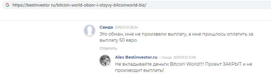 Некая Саида предупреждает пользователей о том, что организация Bitcoin World это настоящий обман, для того что бы вывести средства компания запросила у бедной девушки 50 евро, но выплату денег так и не произвела. Так же её ответили, что данный проект закрыт и не производит выплат, но деньги всё равно дерут.
