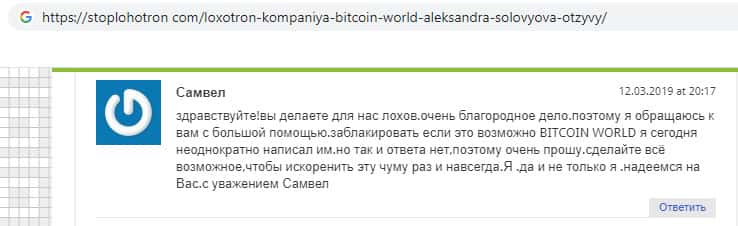 Некий Самвел написал отзыв с просьбой о том, что бы закрыть эту шарашкину контору под названием Биткоин Ворлд, так как компания и так обманула очень много людей, и это не может продолжаться дальше, так как компания даже не скрывает своего мошенничества, и от этого страдает всё больше и больше наивных и доверчивых людей.