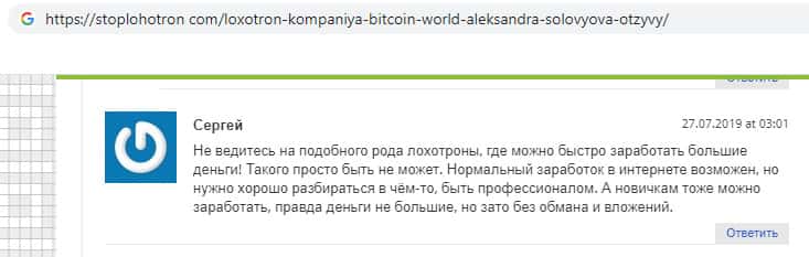 Некий Сергей призывает пользователей что бы они не велись на лохотрон Bitcoin World, так как это явные мошенники, так как невозможно настолько просто заработать в интернете. Это возможно, но для этого нужно очень хорошо разбираться в какой то сфере деятельности, а тут сразу компания предлагает кучу денег за просто так.