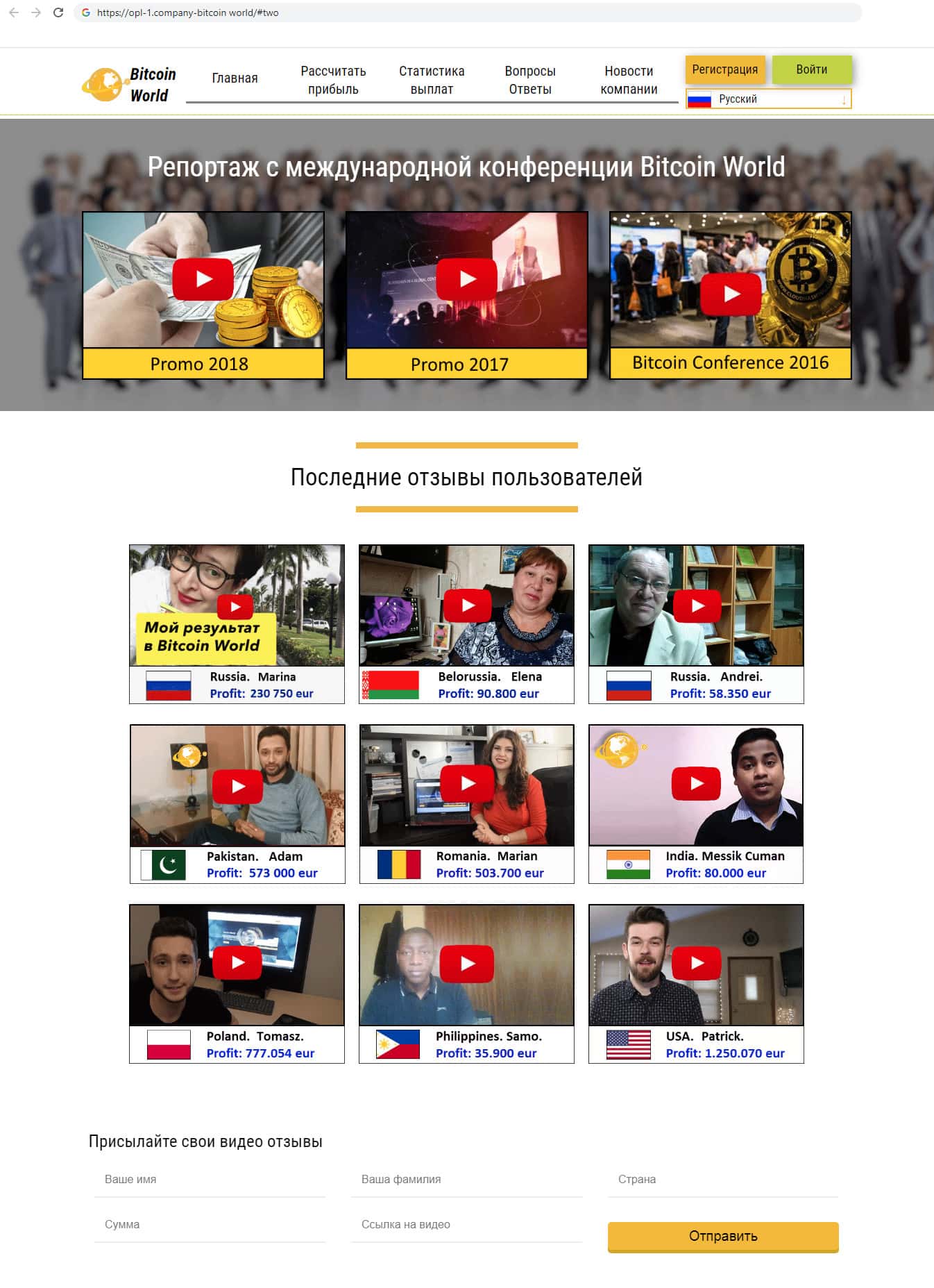 Так же на сайте представлены видео ролики, якобы с международной конференции, но всё это монтаж. Так же представлены якобы видео отзывы от зарубежных клиентов, которые рассказывают как хорошо зарабатывают, но все эти видео это просто фальшивка, так как людям просто заплатили, что бы они сказали эти слова.