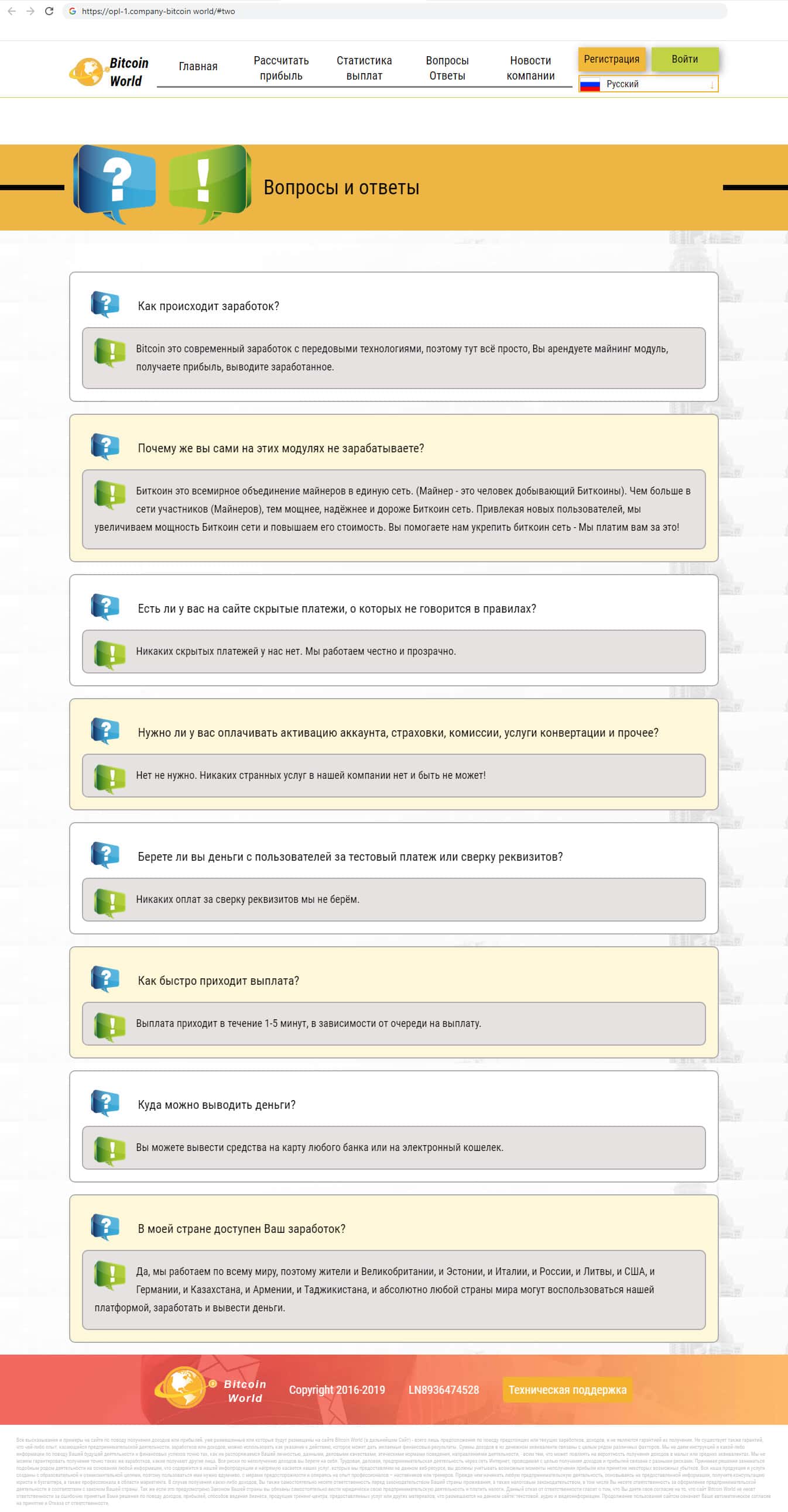 Завершает Главный интернет ресурс компании махинаторов Биткоин Ворлд рубрика под названием "Вопросы и ответы". Там компания сама себе задаёт вопросы и сама же отвечает на них так, что бы посетители сайта повелись на чушь, которую втирает им компания. Весь сайт наполнен ложью и пустой информацией.