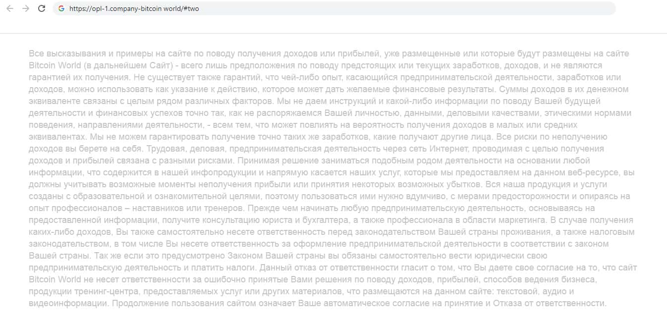 Так же лохотрон Bitcoin World предоставил документ, по поводу отказа за ответственности. Он находится в самом низу сайта, напечатан бледными буквами, которые почти не видно. Там говорится о том, что жулики снимают с себя всю ответственность, и не дают никаких гарантий заработка, но на сайте кричат о том, что гарантируют.
