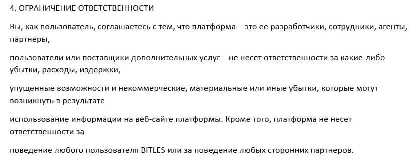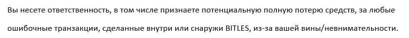 Согласно тому, что аферисты пишут в соглашении, компания Bitles Eu не несет никакой ответственности за не полученную прибыль клиентом, а так же за возможные убытки.