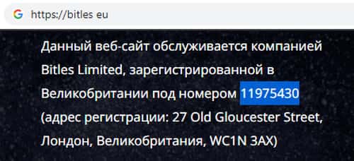 На своем официальном сайте мошенники Битлес предоставили регистрационный номер своей компании, который представлен на скриншоте ниже.