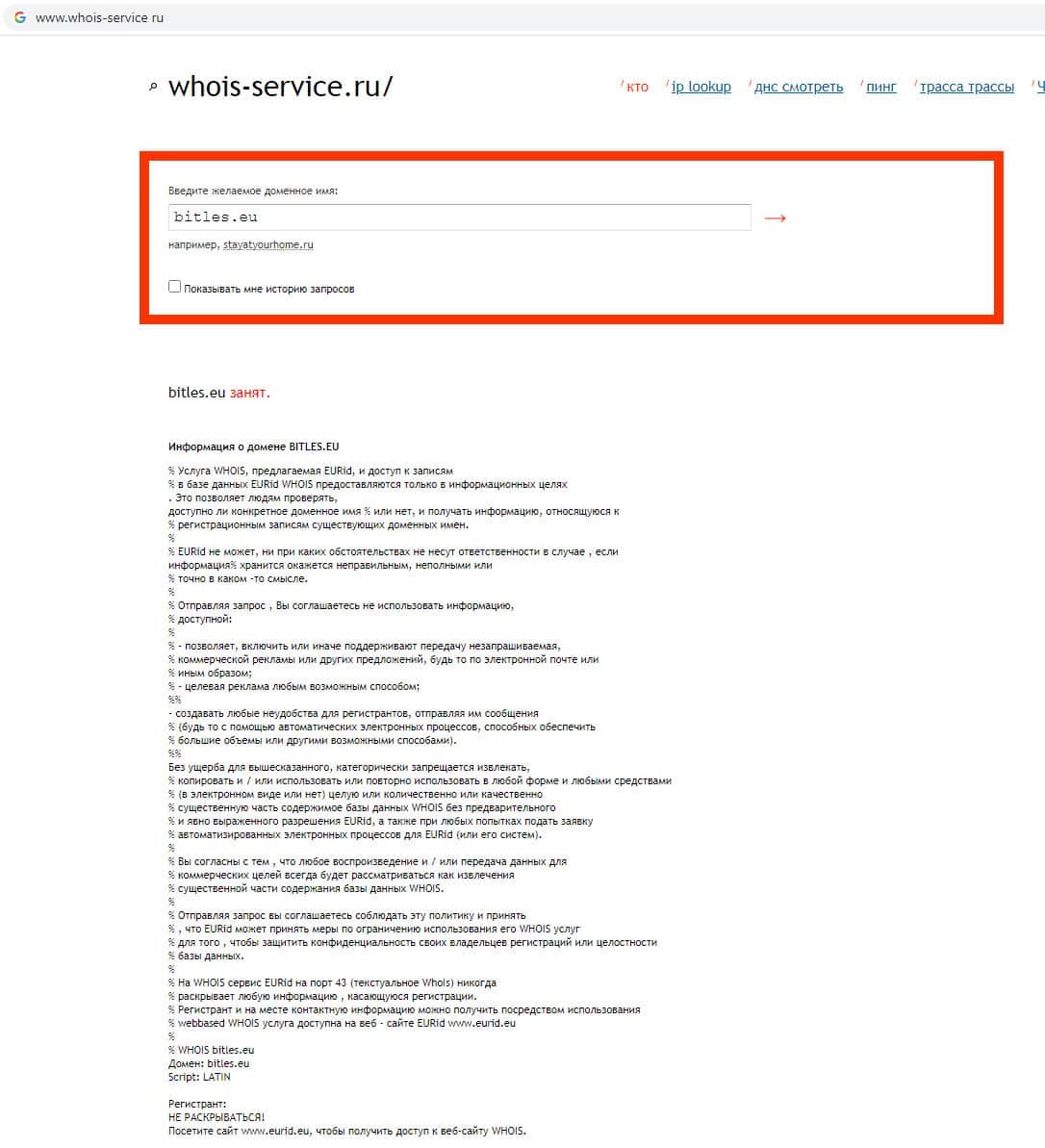 Проведя анализ данных по сайту Bitles Eu, не было обнаружено информации о владельце домена, что является еще одним признаком того, что имеем дело с лохотроном.