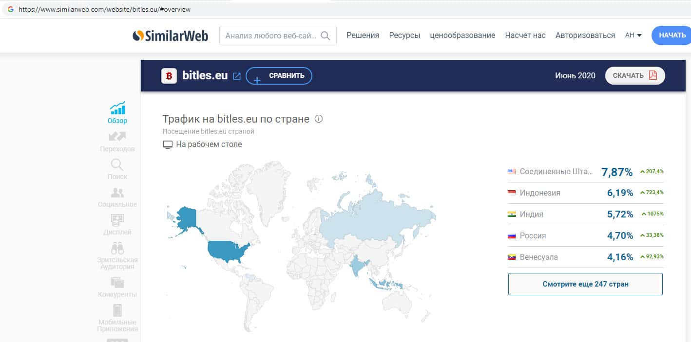 При проверке посещаемости интернет-ресурса мошеннической организации Битлес на similarweb com оказалось, что среди трафика есть пользователи из России.