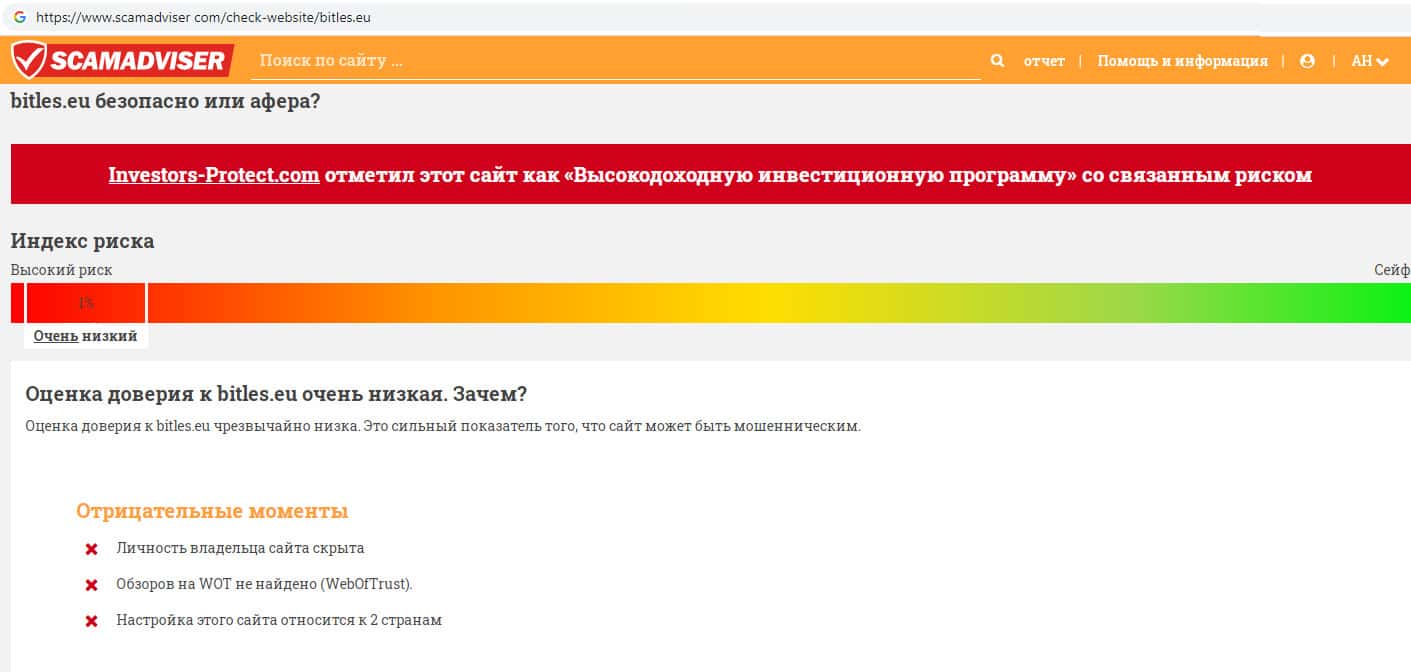 Проверка Bitles Eu на онлайн-ресурсе скамадвайсер ком показала, что у данного сайта низкий рейтинг, а так же выявлено множество отрицательных моментов в работе сервера.
