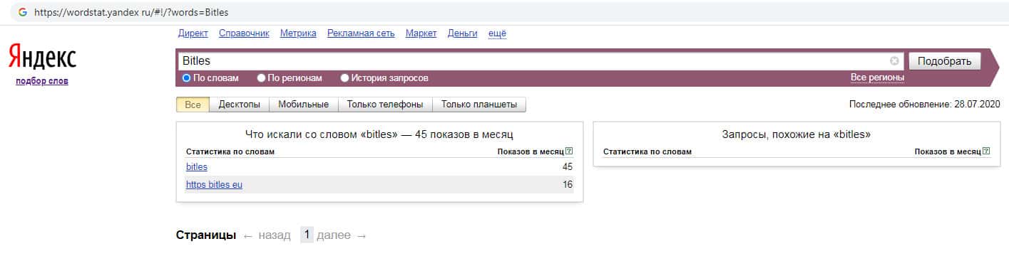 Количество запросов по бренду названия компании на русском языке "Битлес" в поисковике Яндекс составляет 67 запросов за месяц.