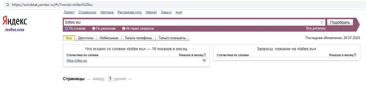 По количеству брендовых запросов названия домена без точки "bitles eu" на Вордстарт Яндекс Ру тот же показатель, а именно 16 показов за месяц.