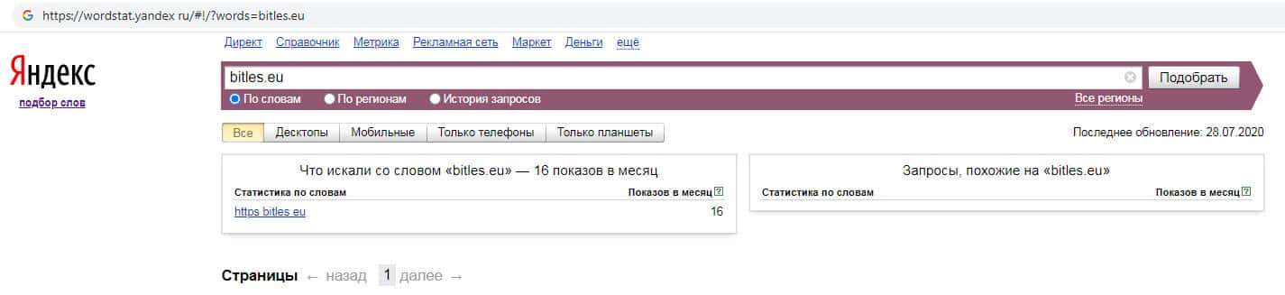 Количество запросов по бренду названия домена сайта с точкой "bitles.eu" wordstat yandex ru составляет 16 запросов за месяц.