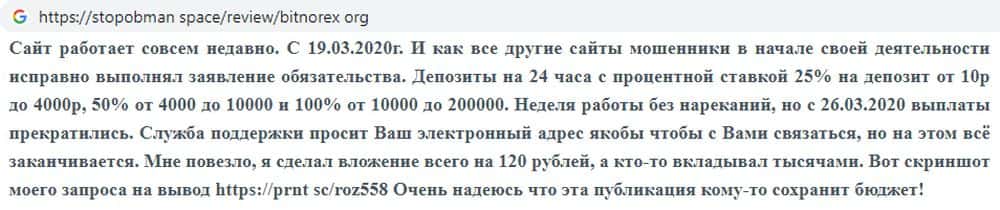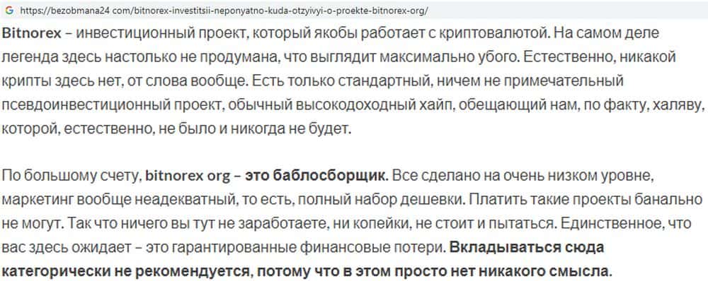 Хайп Bitnorex Org начал свое существование 20 марта, а уже 23 в сети начали появляться первые жалобы от опрокинутых инвесторов. Сам проект полностью схлопнулся еще через три дня. При этом, несмотря на слабую легенду, каталам действительно удалось срубить бабла. Согласно обзору на ресурсе bezobmana24 com, убогим был и сам сайт.