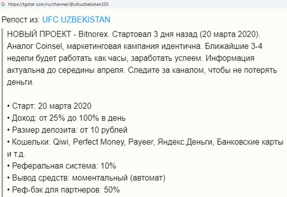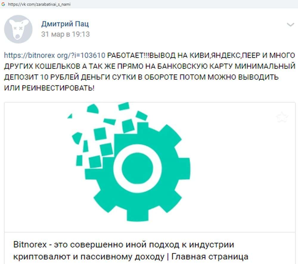 Раскручивалась афера Bitnorex Org при помощи реферальной программы в социальных сетях. Любители хайпов ринулись за рефссылками и массово постили фиктивные отзывы, чтобы нажиться. Их аккаунты, понятно, заблокированы, так как они стали подельниками мошенников, но они и сами потеряли вложенные средства, ведь проект прожил всего 6 дней.