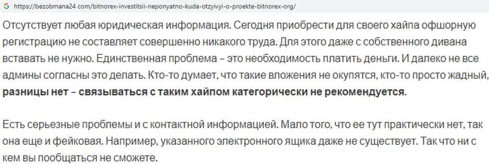 Ожидаемо, что на псевдо-инвестиционный фонд Битнорекс не предоставлял никакой юридической информации. Если у жуликов и была регистрация, то, скорее всего, в оффшоре. Но ресурс безобмана24 ком считает, что для такого дешевого проекта лицензия оффшора - слишком дорого, так что, скорее всего, ее просто не существовало.