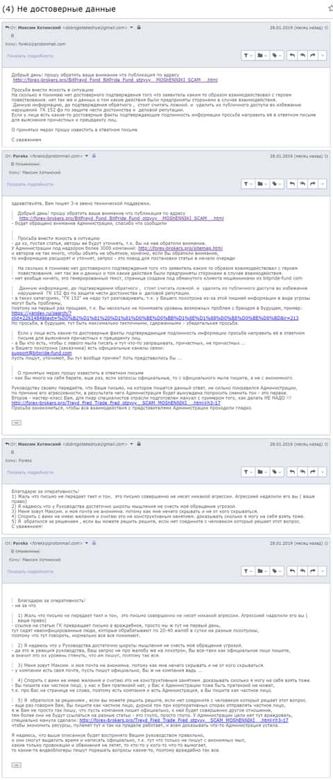 Bit Pride Fund или нет пытается статью снять - достоверное не известно, т.к. по ним пишет какой-то аноним с е-майла [email protected] - Максим Хотинский, он это или это псевдоним - непонятно. Начинает предполагаемый представитель мошенников БитПрайдФонд с угроз - ни он первый, ни он и последний. Всю переписку публикем ниже. Еще замечание - до обращения очередного анонима статьи как таковой не было, мошенники попросили - статью уточнили по их просьбе.