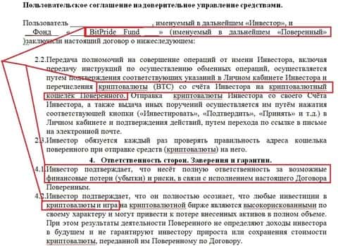 Докумнтик от шарашкиной конторы Бит Прайд Фонд, представляющий собой клиентское соглашение данного крипто-лохотрона внятно предупреждает наивного пользователя сети Интернет о том, что ни в коем случае нельзя иметь дела с BitPride Fund. Потому как переводя на криптовалютный счет этих явных аферистов собственные средства, Вы отдаете деньги неизвестно кому. Также стоит учитывать факт отсутствия какого-либо контроля за данной организацией со стороны регуляторов. Потому как в ихнем шарлатанском договоре четко прописано: вложив деньги в BitPrideFund, будете принимать участие в онлайн-игре. Еще не менее важной информацией является жульнические нормы от БитПрайдФонд, в которых Вас предупреждают, что отвечать за денежные потери клиента они не при каких обстоятельствах не будут.