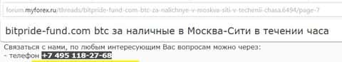 Даже несмотря на то, что жулики БитПрайд Фонд не опубликовали собственный номер телефона у себя на сайте, они его все-равно продвигают в глоабльной сети. Так как телефонный номер +74951182768, принадлежащий аферистам BitPride Fund можно встретить на других интернет-ресурсах, в частности на форуме МайФорекс ру.