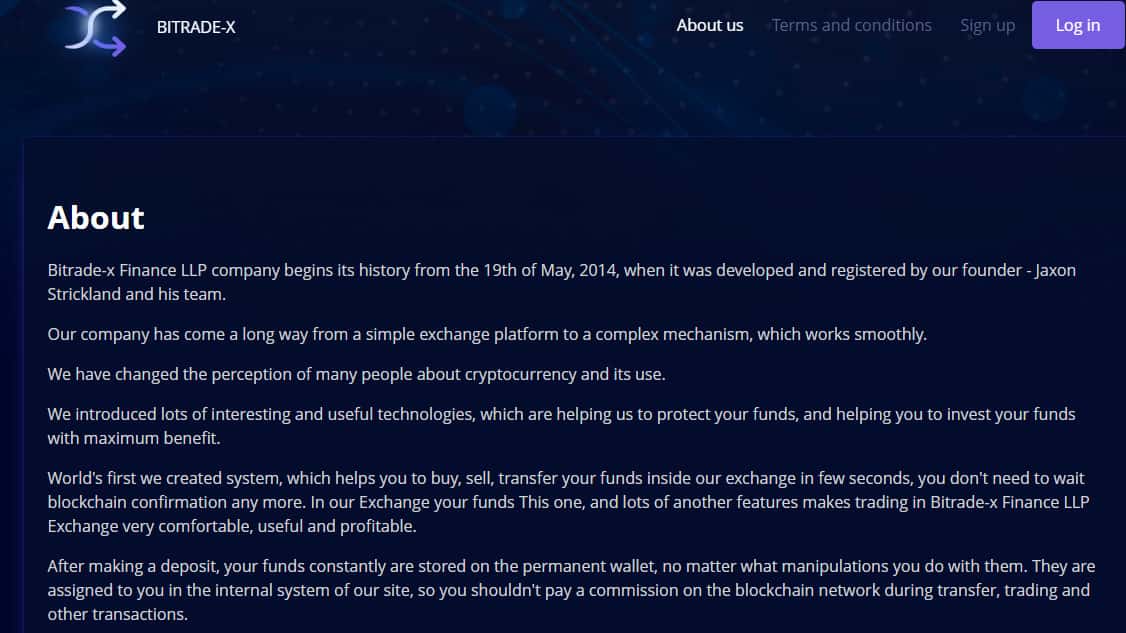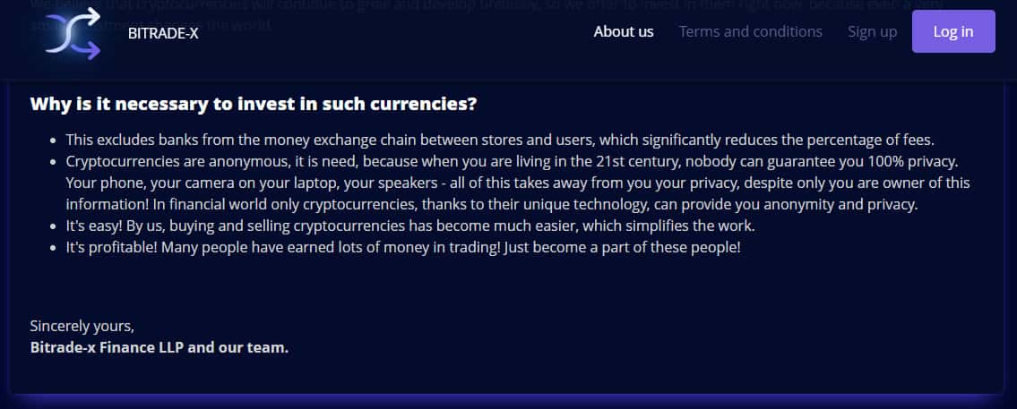 Ввиду халтуры и низкого бюджета при создании своего сайта шулера Bitrade X даже не смогли написать нормального описания своей конторы. Вместо этого у аферистов Битрейд Икс представлен весьма сомнительный текст, в котором шулера Bitrade X вешают лапшу на уши клиентуре. Ниже вы можете увидеть данный раздел сайта жуликов.