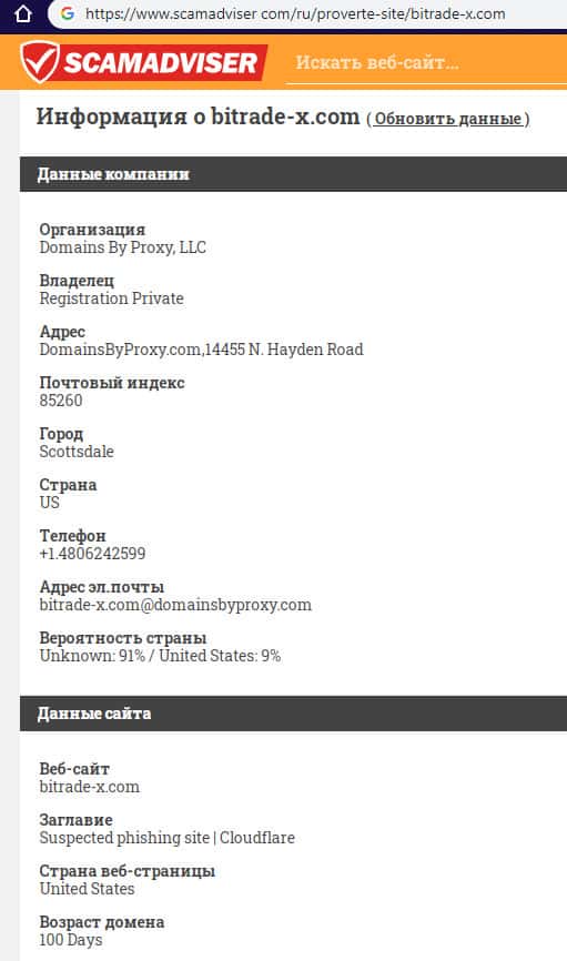 В связи с мошеннической и противозаконной деятельностью лохотрона Битрейд Икс его реальные руководители предпочитают анонимность дабы избежать ответственности со стороны правоохранительных органов. Техническую же информацию о сайте жулья Bitrade X можно узнать с помощью портала scamadviser com, что вы можете увидеть ниже.