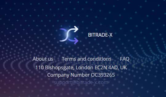 Под свои довольно сомнительные контакты аферисты Битрейд Икс не отводили отдельный раздел своего сайта, вместо этого шулера Bitrade X разместили свои контакты в конце подвального сайта. Данных контактов у аферистов Битрейд Икс довольно мало, что говорит об их не особом желании иметь дело с наивной клиентурой. Итак контакты жуликов: