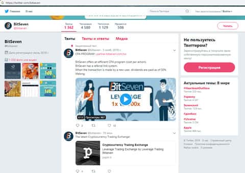 Имеется у лохотрона БитСевен и страница в социальной сети Twitter, в которую мошенники BitSeven не поленились накрутить более тысячи читателей. Почему накрутить? Да потому что активности на постах в Твиттер у аферистов БитСевен нету. На изображении ниже вы можете увидеть страницу лохотрона BitSeven в Twitter.